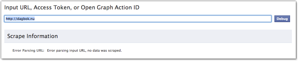 And if I change URL to dagbok.sandman.net which points to the exact same site on the server, the scraper works just fine, so this is a problem with the domain "dagbok.nu" and Facebook. When trying to scrape dagbok.nu I get no accesses in my log file so the scraper doesn't even reach my server!