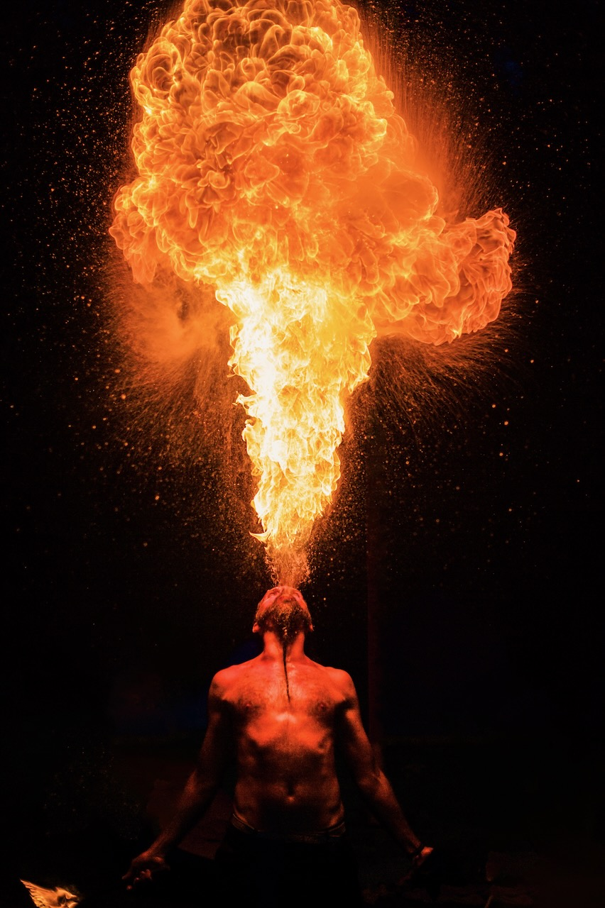 Ett foto på Johan som sprutar eld på vår hemmafestival