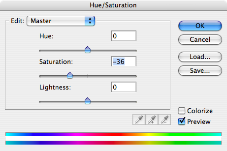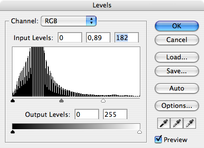 Men som ni ser så matchar ju inte exponeringen av de båda fotona så där jättebra, om ni inte har tur. Använd er av "Image->Adjustments->Levels..." för att sprida färgomfånget lite så det blir lite överexponerat i de ljusa områdena och underexponerat i de mörka. Detta är olika för varje bild så pröva dig fram tills du får ett bra resultat. Sen kan du med "Image->Adjustments->Hue/Saturation..." dra ner färgmättnaden (saturation) så att färgerna inte är så starka.