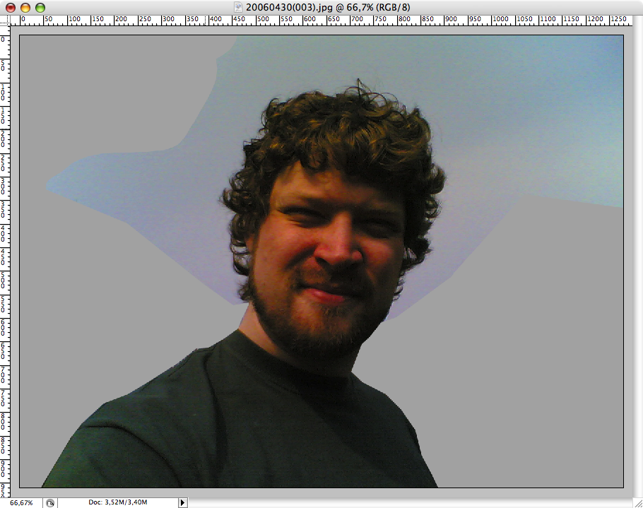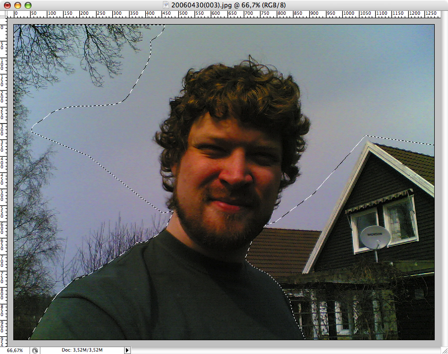 Väl inne i datorn så öppnar du bilden i PhotoShop. Nu måste vi bli av med den tråkiga Sverige-bakgrunden och bara behålla bilden av oss själva. Steg ett är att med hjälp av lasso-verktyget enkelt markera de linjer som är enkla- Strunta i håret just nu, utan koncentrera dig på det som är enkelt, kläder och så. Målet är att ersätta det med en enfärgad bakgrund, så när du har markerat dem, fyll det bara med en färg som påminner om himmelfärgen.