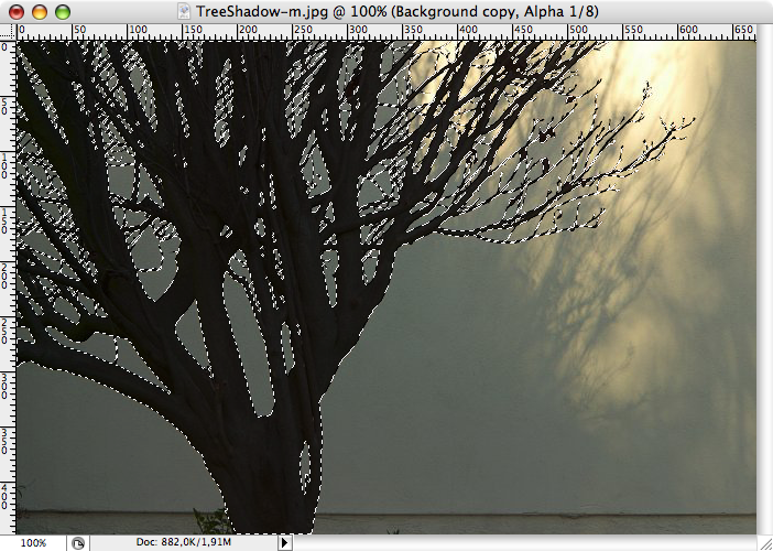 Vi har dock en del struktur av själva trädstammen kvar som spökar lite. Välj Image->Adjustments->Brightness & Contrast för att öka brightness vilket fräter bort dom delarna.
