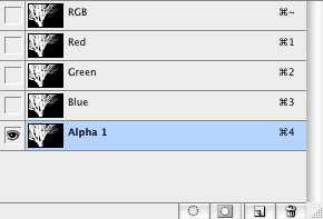 Nu är det dags för masken. Markera först hela ditt dokument och kopiera allt (cmd-C/ctrl-C alltså). I Channels-paletten så skapar du ett nytt lager, som automatiskt kallas för Alpha 1 och är helt svart. Det här är en transparens-kanal i dokumentet och allt svart är genomskinligt och allt vitt är ogenomskinligt och gråtoner är semitransparenta. Vi har inte så mycket gråtoner (beroende på hur starkt du frätte ut vid svart/vitt och Brightness/Contrast).