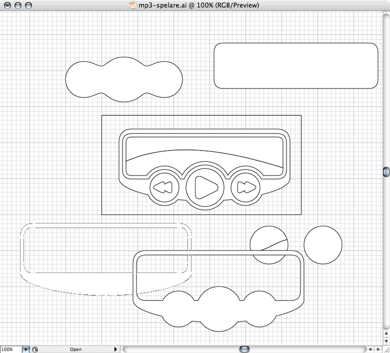 Vi börjar i Illustrator och skapar primärobjekten, vilket kort och gott är de olika former vi kommer arbeta med för att skapa gränssnittet. Med illustrationsverktygen är det enkelt at skapa vackra former med bezierkurvor (se bilden, formen längst ner till höger gar små "handtag", vilket är knutna till dess bezierkurva)