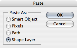 Nästa steg är att kopiera ett objekt in i klippminnet och gå över till PhotoShop där vi skapat en canvas som rymmer vår mp3-spelare. När vi väljer klsitra in där så kommer dne här dialogrutan upp. Välj "Paste as Shape Layer" för varje objekt.