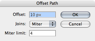 För att skapa banor som är X antal pixlar mindre än banan man redan har (för displayen till exempel) så använder du Object->Path->Offset Path... vilket vissar den här dialogrutan som låter dig bestämma hur många pixlar (använd minusvärden för att förminska) mindre eller större den nya banan ska vara. Originalbanan behålls oförändrad.