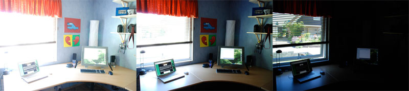 Sen använde jag en rad olika verktyg i Photoshop (mer om dessa senare) för att kombinera de tre ovanstående bilderna till en HDR-bild. Som ni ser så kan man se vad som finns utanför fönstret samtidigt som man kan se vad som är på skärmarna och även skuggområden blir bra.