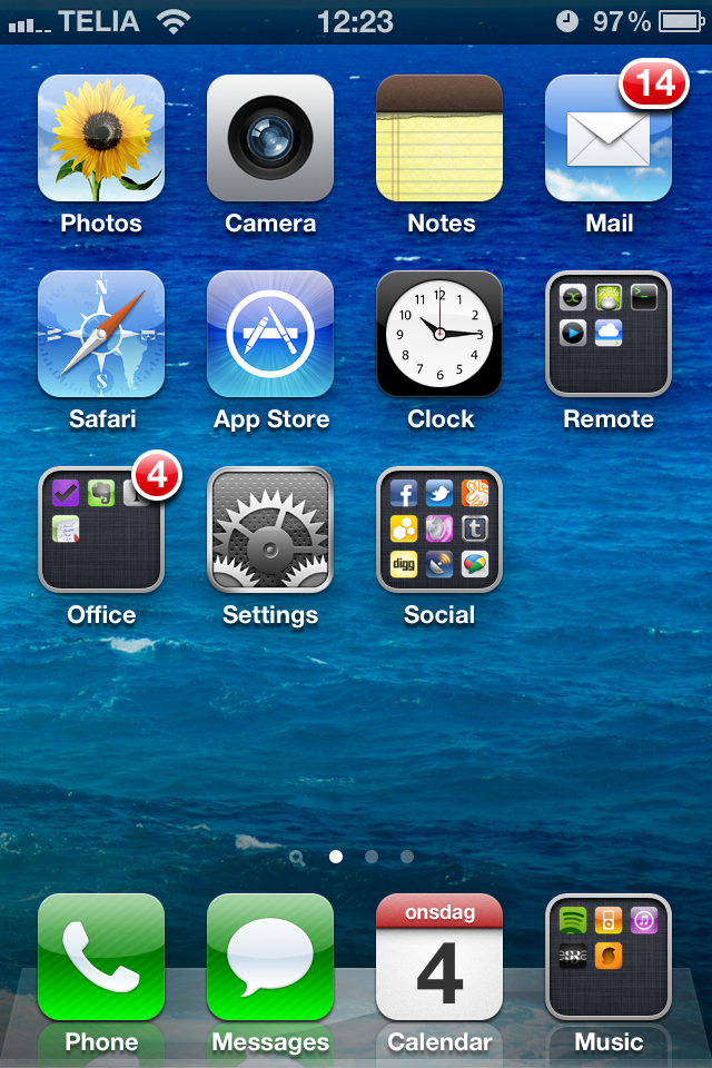 Skärmen på iPhone 4 är helt fantastisk. Klicka på bilden till höger för att se min hemskärm i full upplösning. Den är alltså "ihoptryckt" på en 4-tums display vilket ger en otroligt hög upplösning. När man läser text så är det som om det är en klisterlapp på skärmen, som sådana där displaytelefoner i butik. Det måste ses för att man ska fatta hur snyggt det är. Och med den nya displaytekniken så är pixlarna närmre ytan så att säga, så det är verkligen som en klisterlapp.