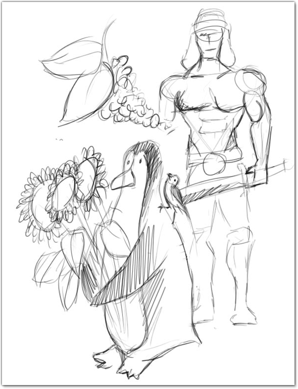 What the hell? Vad är det för en himla beskrivning? Pingviner, blåmesar och Conan i en enda röra? Jag har ingen aning om hur tusan en tavla med alla dessa element skulle se ut, men jag slängde ihop en liten snabbskiss som ni ser här till höger. Vad tror ni, blir det ett mästerverk?