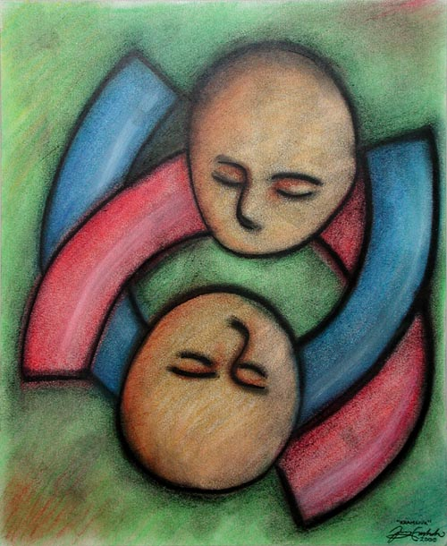 En tavla i pastel som ska föreställa mig och Tina kramandes. Detta är kärlek minsann!