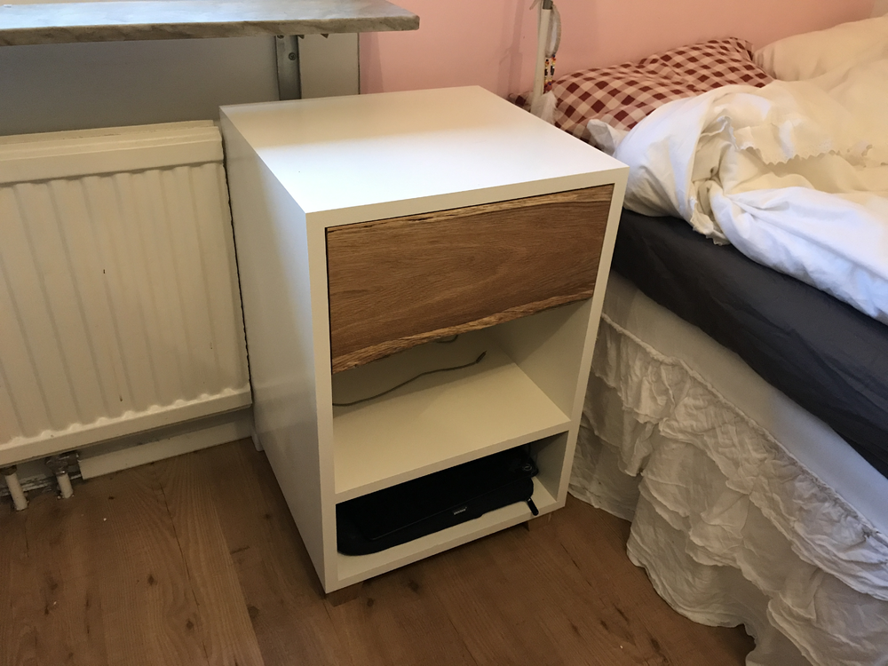 Min dotter har sagt att hon vill ha ett nytt nattduksbord, och jag såg en design jag gillade så jag gjorde en liknande lösning. Den är byggd i MDF och med en "live edge" ekskiva som lådfront. Jag ville måla den ljusgrå men hon ville ha den vit, så det fick bli vitt.