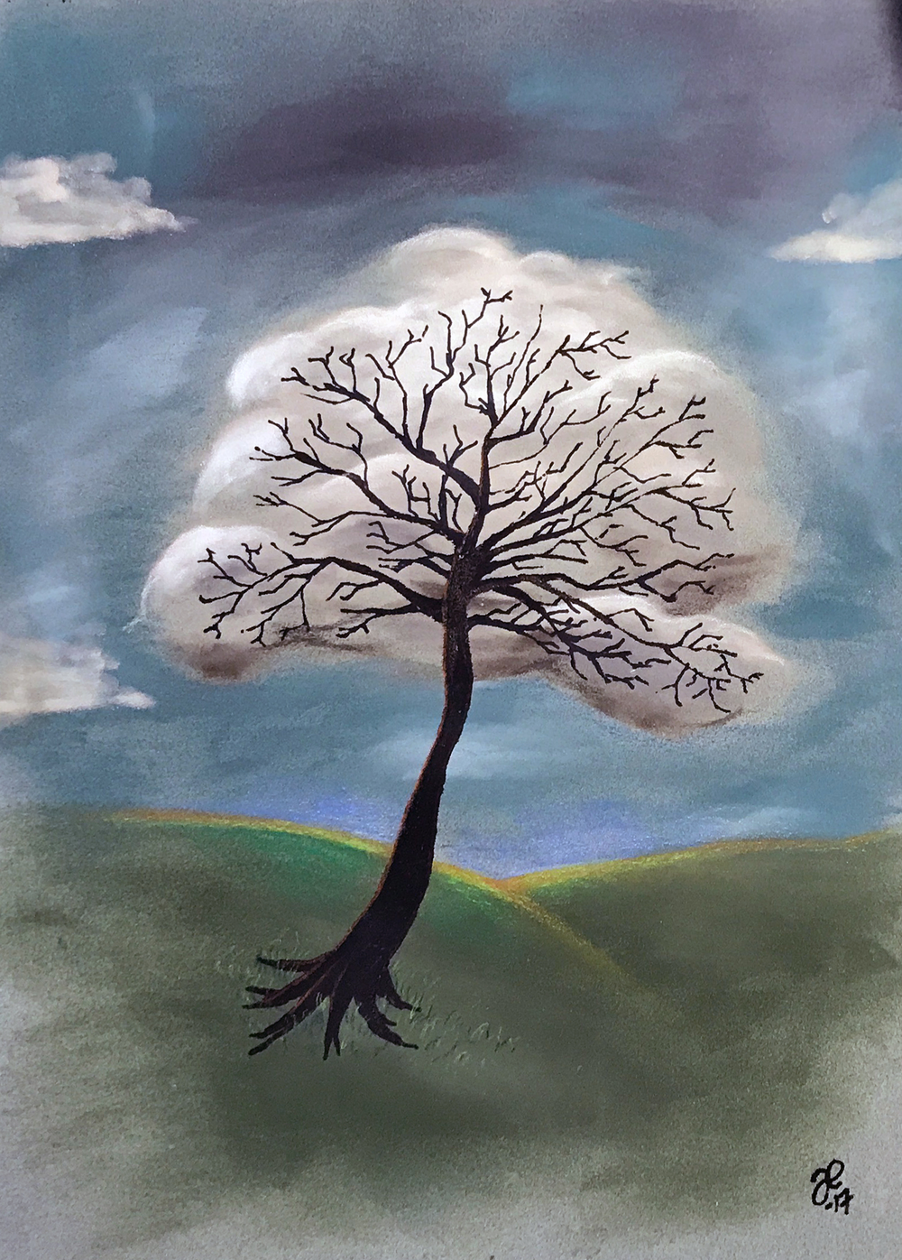 Men det fina med PanPastel är att man enkelt kan skapa stora konsekventa färgytor samt blanda färgerna hur man vill och det underlättar. Jag målade molnet, himlen och kullarna med PanPastel och använde sedan fixativ för att fixera det så jag kunde gå efter med tusch och måla trädet.