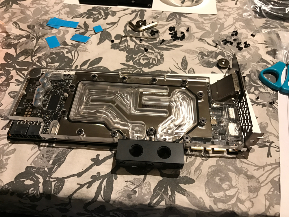 Uppstädning bland sladdar samt vattenpump monterad och vattenblock på GPU:erna. Det riktigt suriga var att med vattenblocket där så passar inte Nvidias HB-bridge för SLI. What the hell! Läste mig till att vissa hade kapat de spetsiga kanterna på bryggan och fått den att passa. Får se hur jag löser det.