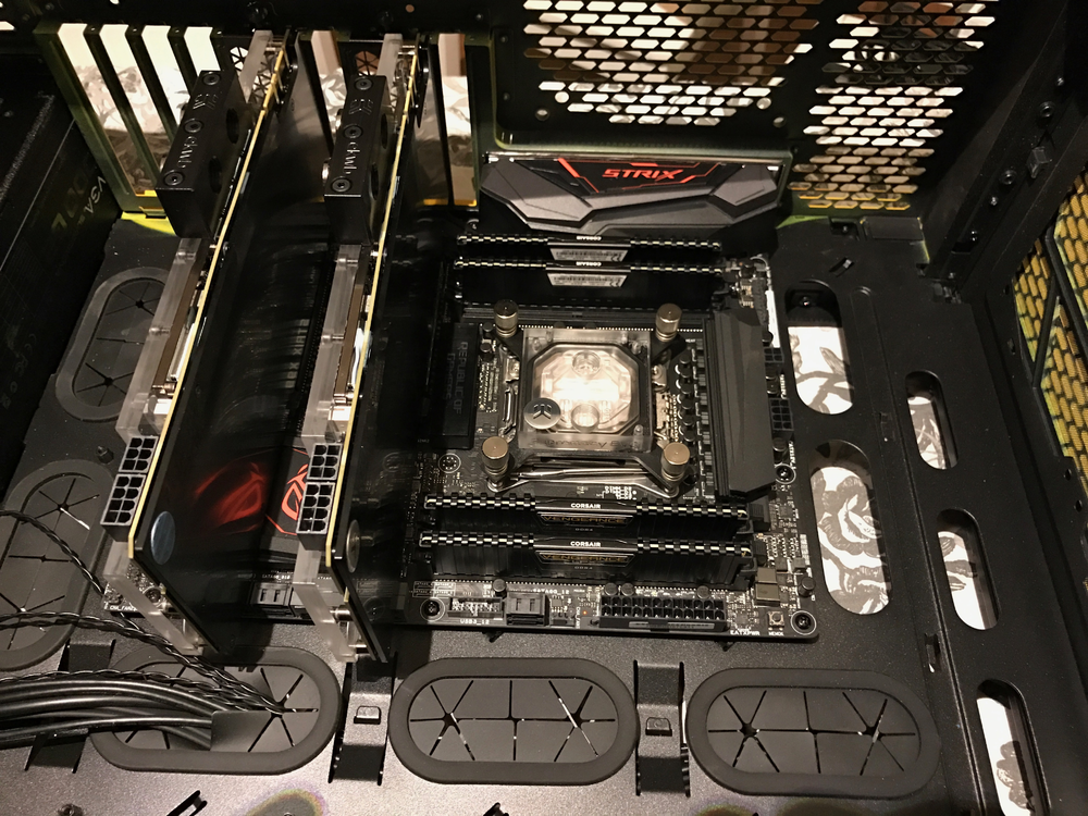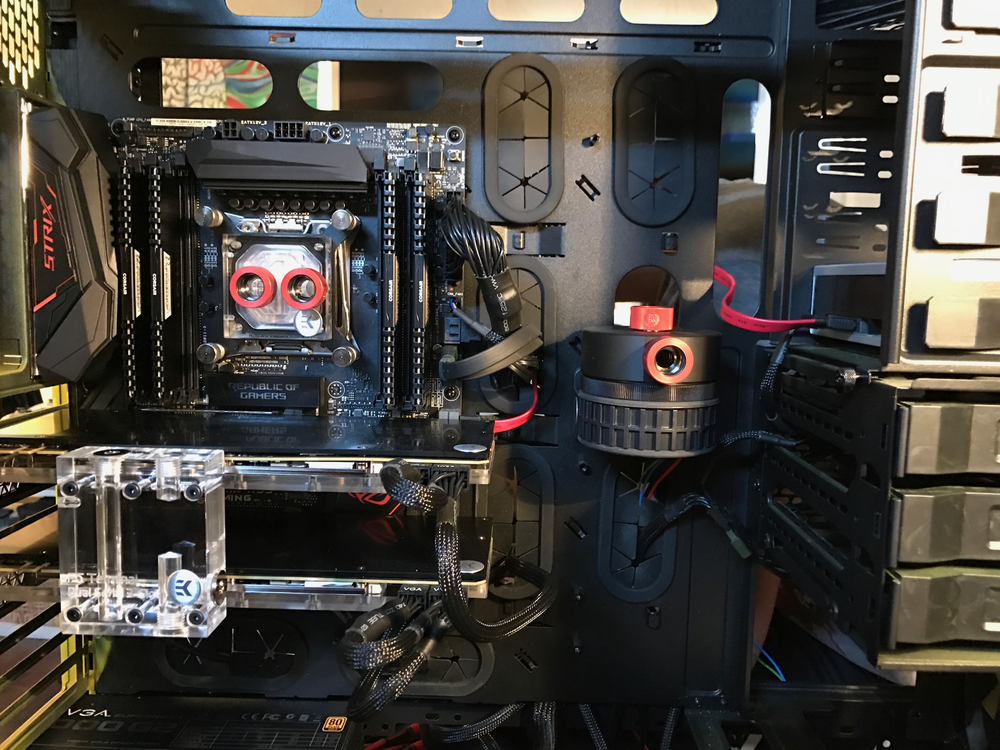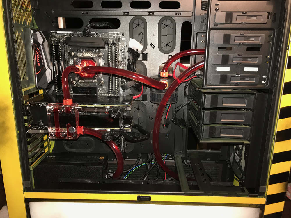 Fick lov att flytta hårddiskarna upp i lådan för att få rum med den enorma radiatorn i botten. Helt plötsligt är det inte fullt lika rymligt i lådan. Jag har även monterat vattenblocks-kopplingen mellan grafikkorten. Fortfarande sladdar som går lite väl mycket huller om buller, ska städa upp bland dem.