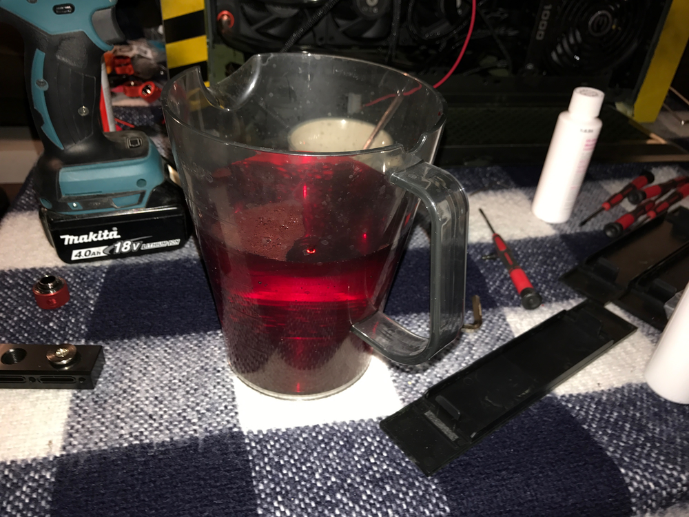 Och så blandar vi till lite vinbärssaft! Blev en rätt frän röd färg, "blood red" heter den och blandades ut med batterivatten från Biltema.