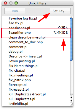 To insert this as a filter in BBEdit, save the above filter in BBEdit's script folder (in the menu #!->Unix Filters->Open filters folder) and then open the filter window palette (Windows->Palettes->Unix filters) and setup a shortcut key for the script. Then you're done! BBEdit will send along the current selection or the whole document (if no selection is active) in $argv