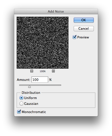 Börja med att skapa ett nytt lager och fyll det med svart färg och sätt det till "screen", sedan så väljer du Filters -> Noise -> Add Noise. Där ser du till att det öär ungeför 100%, Uniform och framförallt Monochromatic.