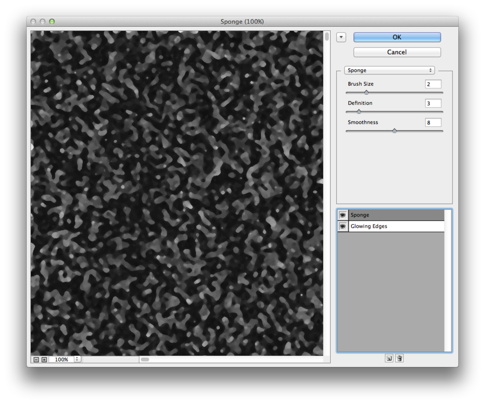 Sedan i Filter Gallery kan du lägga till en till effekt med knappen under, lägg då till samma SPonge-effect som innan för att mjuka upp snöflingorna, lek lite med inställningarna här för att få ett resultat du gillar.