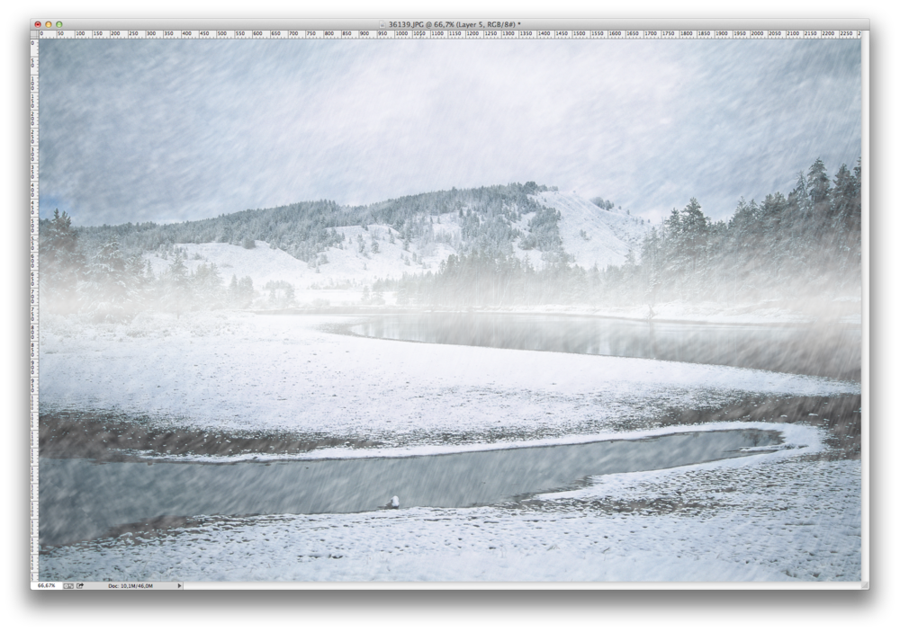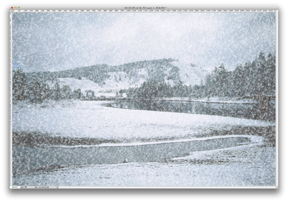 Här är resultatet, och vi har då snö i två lager som rör sig annorlunda, vilket ger mer realism. Och det finns massor med filter du kan använda på dessa lager för att skapa olika resultat, prova dig fram!