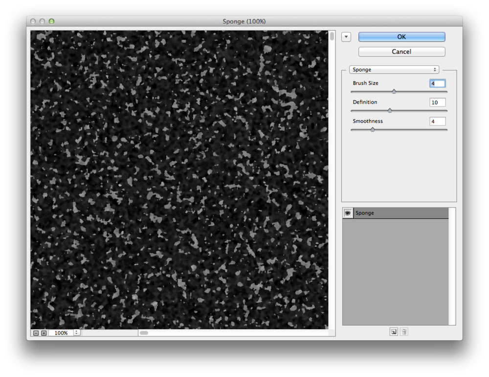 Resultatet blir vitt "noise" över bilden. Påminner lite om snö, men vi är inte klara. Gå nu till Filter -> Filter Gallery... och välj Artistic -> Sponge och välj inställningarna du ser i bilden. Det får inte vara för stora "klumpar".