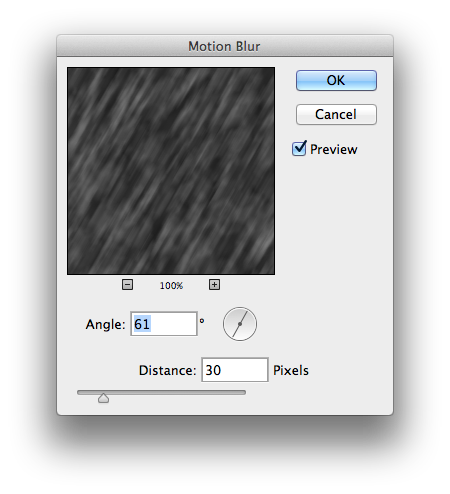 Hej, detta ser ju nästan ut som snö. Nu går du till Filters -> Blur -> Motion blur och ställer distance på 30 pixlar ungefär (lite beroende på hur stor originalbilden är) och vinklar det snett nedåt.