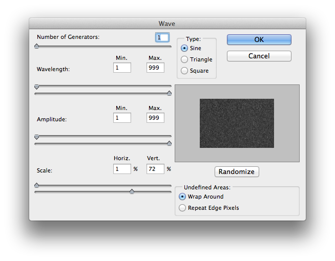 Nu har vi snö som faller snett nedåt, men det ser inte riktigt ut som om det är något liv i vinden och hur den rör sig. Gå till Filters -> Distort -> Wave och här är det lite klurigt. Du ska ha en generator, och wavelength ska vara 1-999 och samma med Amplitude. Scale behöver du inte ha max på understa (pixlarna kan bli lite väl utdragna då) utan testa dig fram, jag körde med 72% Se till att du använder Sine och Wrap around.