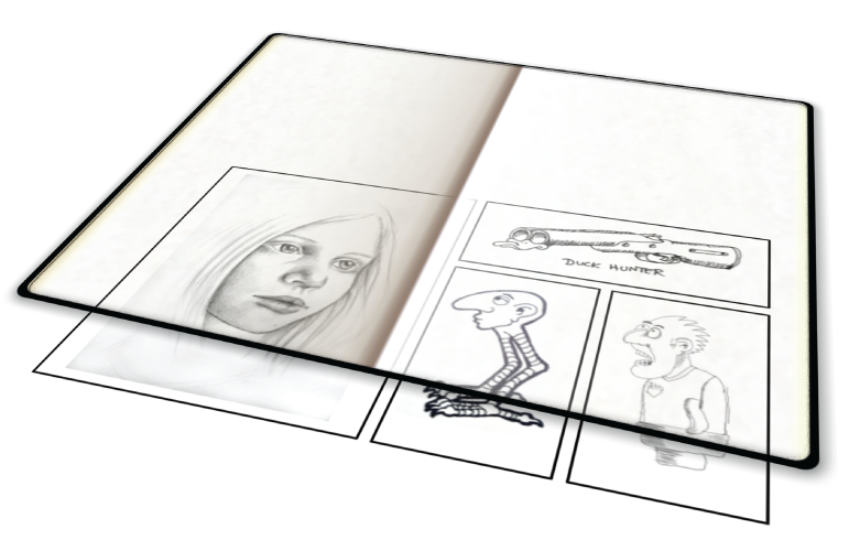 Jag har ju sett massa sådana här på nätet, på folks hemsidor,men då är det ju frågan om riktiga skissböcker dom har fotat/scannat in, medan jag vill sköta det på ett lite annorlunda sätt eftersom jag ska vara så himla speciell. För det första så är varje liten skiss en egen JPG-fil i en mapp, sen vill jag positionera ut dem på ett uppslag på ett intelligent sätt, men jag vet inte riktigt hur. Jag vill inte ha en skiss per sida (men däremot gärna att en teckning tar upp en hel sida). Så man måste räkna ut lite hur dom ska positioneras för att få upp till kanske fyra på en sida. Sen ska de ju blandas med de "riktiga" teckningarna från min portfolio.