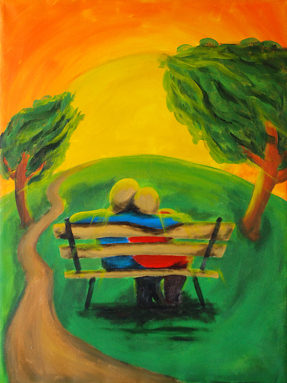 bad mig måla en tavla som han kunde ge bort som present eftersom han ska på bröllop på idag (på sin egen födelsedag! Undrar om han kommer sno tavlan själv kanske?). Tjejen som gifter sig är en gammal klasskompis till mig och Stillmans idé var att det skulle vara ett par som satt på en bänk vid en park. Det lät ju fint.