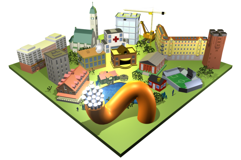 Illustration av en stad i 3D, en variation av en tidigare illustration, denna med en fet fiberkabel som kommer upp ur marken.