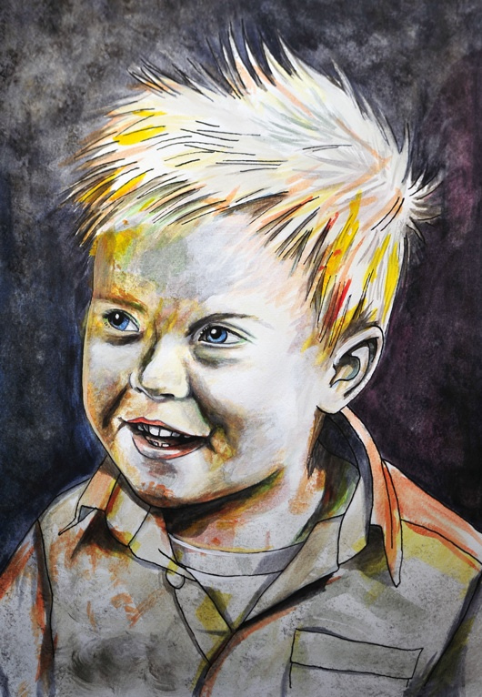 Blandat akvarelle/bläckporträtt på min systerson Svante