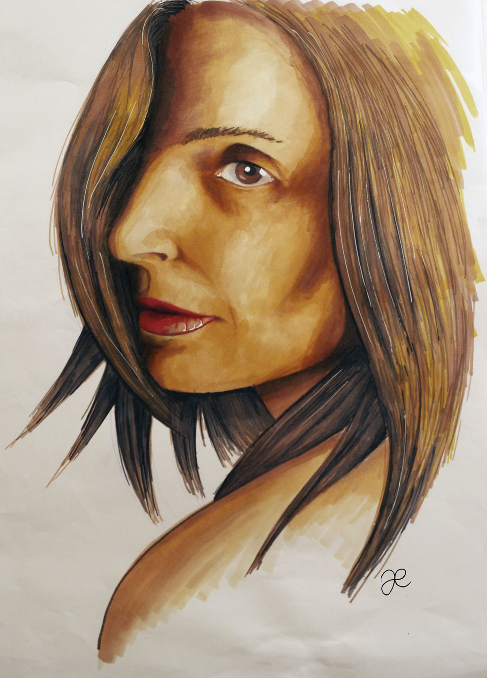 Hon är i alla fall sjukt sjukt duktig och målar porträtt med inget annat än Tria Markers och ProMarkers (och lite vita gel-tuschpennor). Hon har även gjort en hel del timelapse-filmer på när hon tecknar porträtten, min favorit är denna på hennes porträtt av Foki, originalbilden kan hittas här.