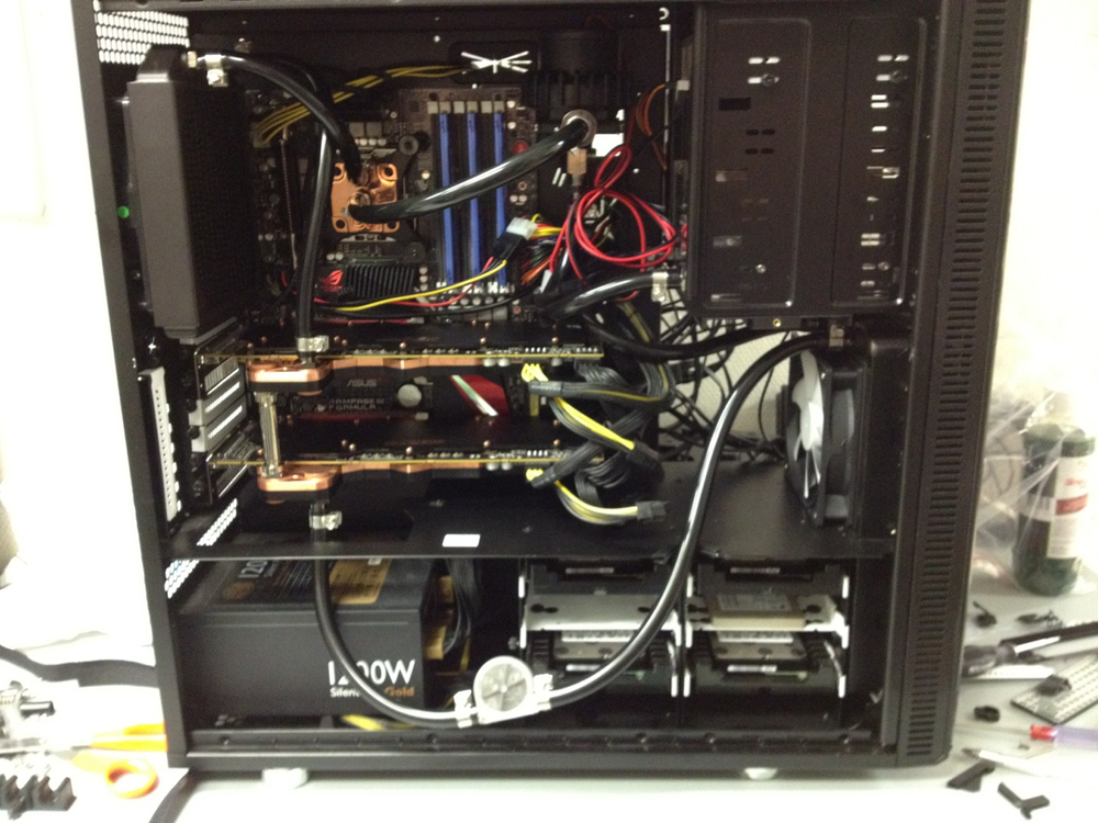 Med luftkylningen så kunde grafikkorten lätt komma upp till 85 grader i Crysis 2, så det är ju en drastisk skillnad. För att inte tala om ljudet. Datorn har numera tre stycken 120mm fläktar, en bak, en fram och en i sidodörren. Datorn är i stort sett helt knäpptyst. Min Netgear NAS låter mer.