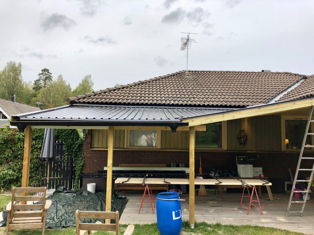 Sen på med plåttaket, först var det i hörnet upp mot befintliga taket, att få det tätt och få in plåten under på rätt sätt, men med hjälp av sonen och sena kvällar så fick vi till det