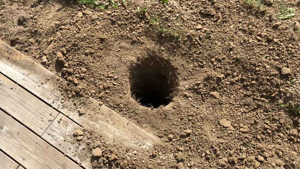 Sen gräva tre hål i gräsmattan precis utanför altanen
