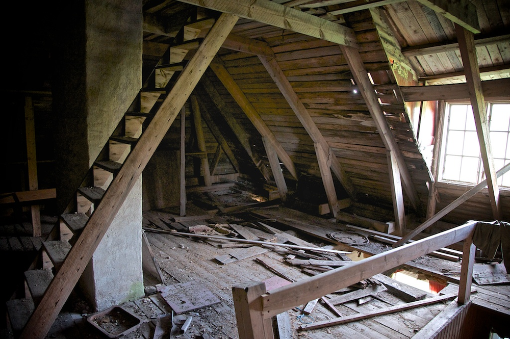 En vävstol står halvt nedsjunken i ett sviktande golv på övervåningen