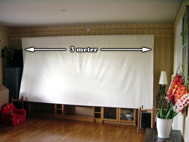 Vårat vardagsrum är ungefär 6x4 meter, och vi har en bokhylla står på den bortre kortväggen. Jag har (nej, min mor har) sytt upp en duk av gummibestrykt tyg jag köpte för 49kr/m på Billiga Nisse. Det släpper inte igenom ljus alls och reflekterar väldigt bra. Sedan har jag (nej, min mor har) sytt två kanaler över och under för rundstavar som jag köpte på K-Rauta. Dom ska senare sågas till och sättas upp, men just nu är hela duken bara upplagd på bokhyllan och fixerad med två skruvar så den inte rullar av (bättre än innan, då jag hade ett sänglakan som jag hade satt fast med hjälp av en trave böcker).