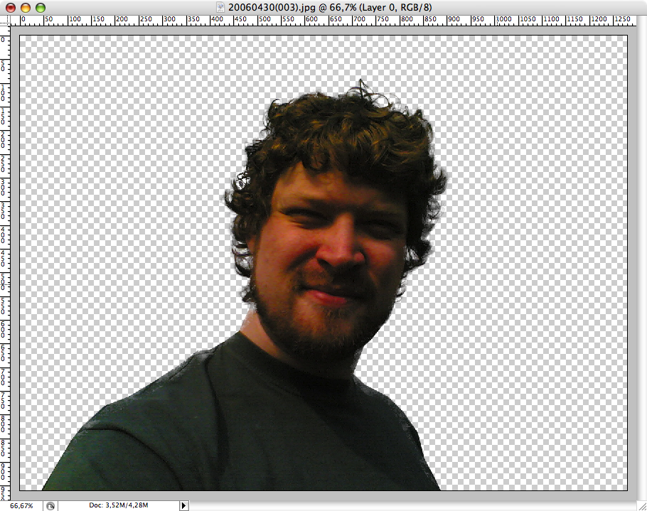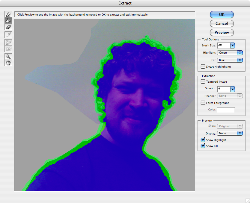 Sen ska vi använda en trevlig funktion i PhotoShop (CS1 och CS2) som heter Extract i Filter-menyn. Välj den och så får ni upp bilden i ett nytt gränssnitt. Där ska man med en grön "märkpenna" markera vilka delar av bilden som är konturer. Sen fyller man den formen med färgverktyget som bildar en blå fyllning. Ser konstigt ut, men när ni gjort det rätt och trycker på knappen så blir all yta som inte är den som är inne i markeringen transparent, och den gör också ett halvhyffsat jobb med håret. Det här steget är ju bara intressant om man har en massa hår som är svårt att frilägga. är du snaggad eller har satt på dig en sjysst solhatt så kan du ju använda lassoverktyget för allt.