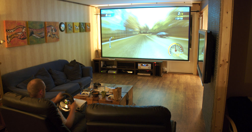 Så vi satte igång karriärläget och körde varannan gång, trimmade bilen och hade oss. Satan vad skoj vi hade! Det är precis lagom mycket trixande med bilen för att man inte ska förlora sig i RPG-liknande uppgraderingscykler samtidigt som själva racingen är ren och skär arkadglädje. Jag har ju ratt ill Xboxen så med den i knät och med pedalerna låsta mot kistbordet så turades vi om att sitta i biofåtöljen och spela på den 130 tum stora duken med full HD-upplösning via projektorn.
