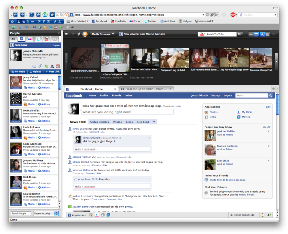 Tänkte tipsa om en webläsare som inte alls är ny, men som jag använder flitigt. Hela Web 2.0-grejen är ju skoj, med communitysiter högt och lågt. Och med Flock så kan man enkelt sy ihop dem i ett gränssnitt, vilket är himla trevligt. I bilden ovan ser ni hur det hela ser ut. Till vänster så ser ni People Sidebar där mina vänner via olika online-tjänster syns, ovanför flikarna så ser man Media Bar, där man kan se senaste bilderna från vänner eller dylikt. Den har stöd för en uppsjö av tjänser (utom deviantArt, grmbl) och det är faktiskt riktigt behändigt att ha all community-relaterat i en egen webläsare och "vanligt surf" i Safari. Så man liksom separerar det lite.