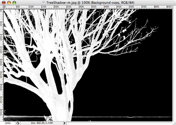 Välj nu Image-Adjustments->Invert för att invertera färgvärdena i hela bilden. Då ser det ut så här. Problemet är att vi har en hel del blåa pixlar ute på vissa kvistar, det är inte bra.