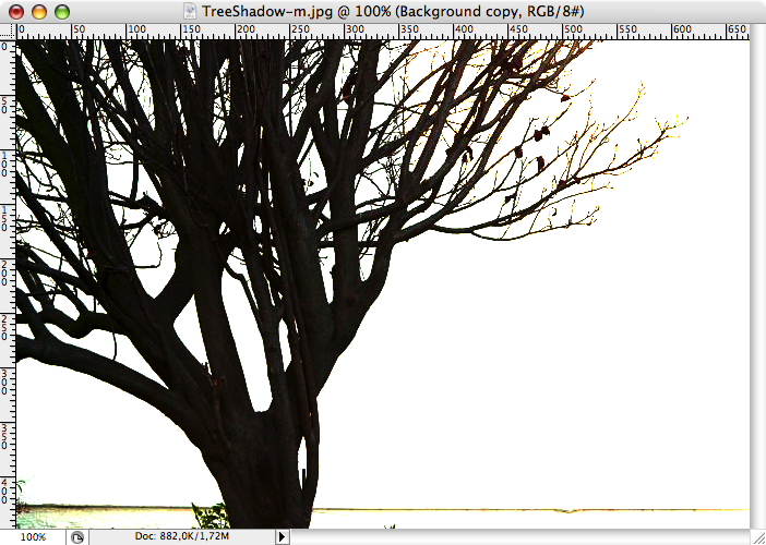 Vi har dock en del struktur av själva trädstammen kvar som spökar lite. Välj Image->Adjustments->Brightness & Contrast för att öka brightness vilket fräter bort dom delarna.