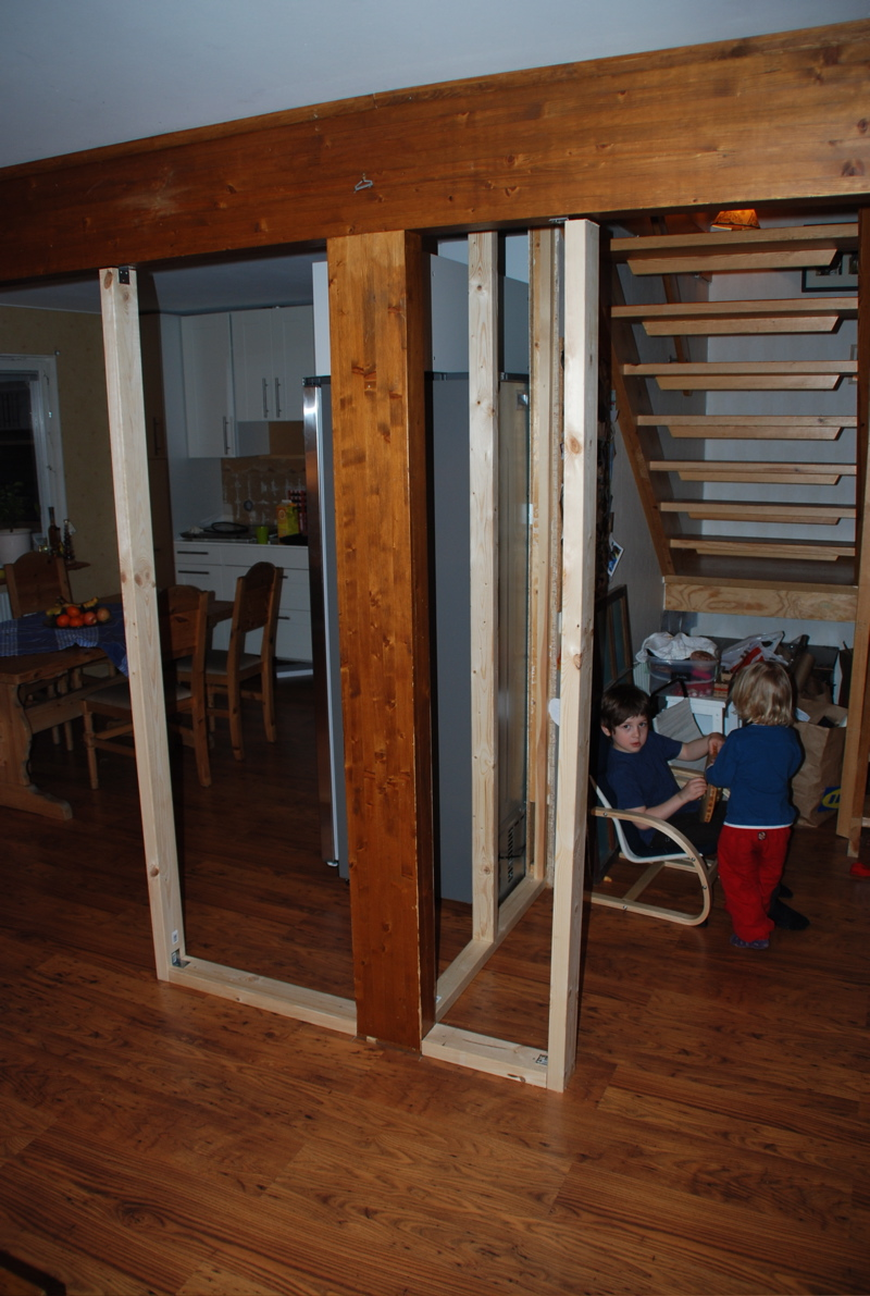 Nu har jag satt upp stommen för den nya väggen. Måste ha en släpvagn om jag ska få hem OSB, gips och MDF-skivor för de olika väggsidorna.