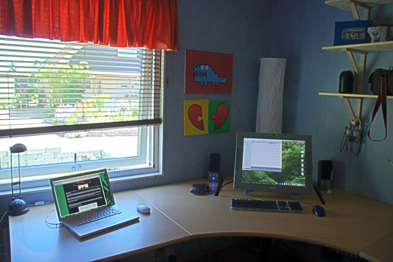 Sen använde jag en rad olika verktyg i Photoshop (mer om dessa senare) för att kombinera de tre ovanstående bilderna till en HDR-bild. Som ni ser så kan man se vad som finns utanför fönstret samtidigt som man kan se vad som är på skärmarna och även skuggområden blir bra.