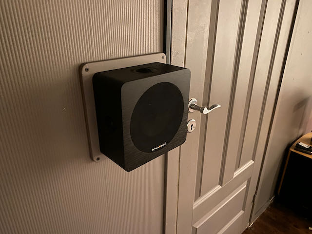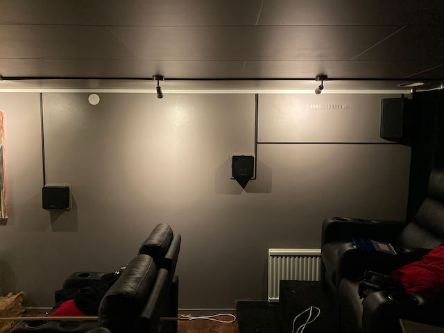 Sen upp på väggarna. Helt klart pilligt att få upp själv men det gick bra till slut. En av högtalarna hamnade på skivan som sitter för fönstret i rummet.