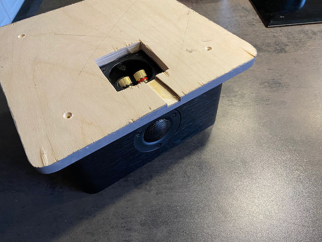 Nästa steg är hållare för alla högtalare, det följer med sådana nyckelhålsfästen, men då dom sitter på väggen precis på väg mot tvättstugan så ville jag att dom skulle sitta lite mer stabilt, så bort med alla sådana fästen, sen fixa skivor som skruvas fast i högtalarna bakifrån, med utfräst för kablarna.