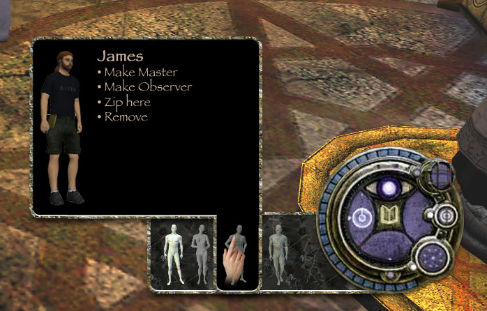 So the first mode is the Master Mode, in which a player in the game is chosen to be the Master. This means that whatever is seen on the Master's screen is also shown on the others screens. This is great for transporting between areas or just to keep talking and discussing clues while the game-play continues. One player is doing all the working and the others just tag along and discuss things, just like you would play Myst or Riven with friends. This mode can be played in both third and first person perspective of course, and regardless of which, what the Master sees, the client sees. The position as Game Master can be moved to another player at any time.