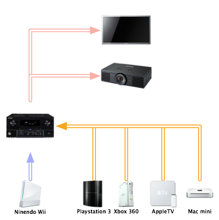 Med en massa prylar sammankopplade i hembion är det lätt hänt att det blir väldigt mycket sladdar. Jag skrev lite om hur alla sladdar hörde ihop i texten Kablage sabotage där jag hade en liten skiss på hur alla sladdar hade dragits. Här syns en skiss på hur det ser ut idag. Mycket mycket trevligare. Med HDMI på nya Mac mini och två HDMI-ut på förstärkaren så drar man ner drastiskt på antal sladdar. Och det känns så mycket mer rent och prydligt.