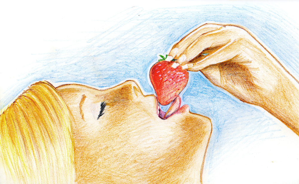 Dagens teckning på en tjej som förföriskt tar sig an en Fragaria ×ananassa (jordgubbe, eller earth man!). Tack, det var allt!