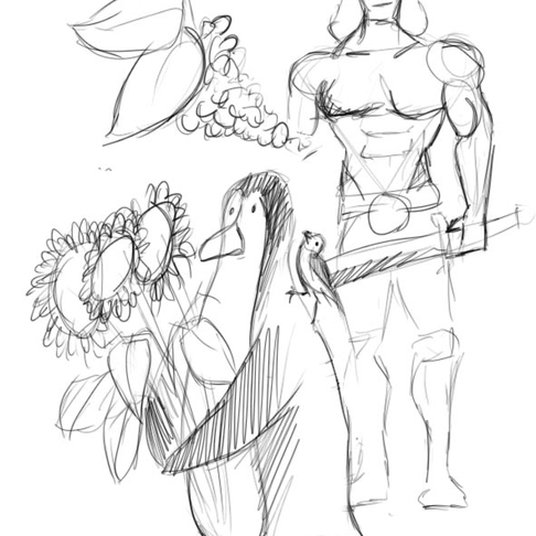 What the hell? Vad är det för en himla beskrivning? Pingviner, blåmesar och Conan i en enda röra? Jag har ingen aning om hur tusan en tavla med alla dessa element skulle se ut, men jag slängde ihop en liten snabbskiss som ni ser här till höger. Vad tror ni, blir det ett mästerverk?