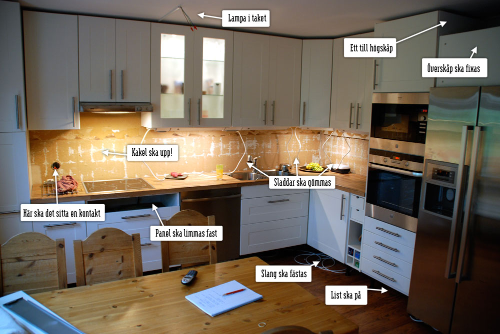 Ok, tänkte bara lägga upp en bild som visar hur mycket det är kvar på köket. Då elektrikern varit här så är elen inkopplad och det ser mycket bra ut, förutom lite lösa sladdar här och där.