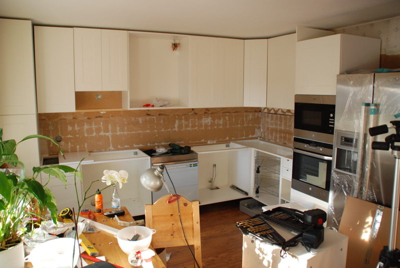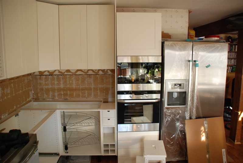 Utöver det så är skåpen nu på plats, en del vitvaror är intagna bara för att kolla mått och sådant och de flesta luckor och lådor är isatta .Det börjar nästan, men bara nästan, likna ett kök igen.